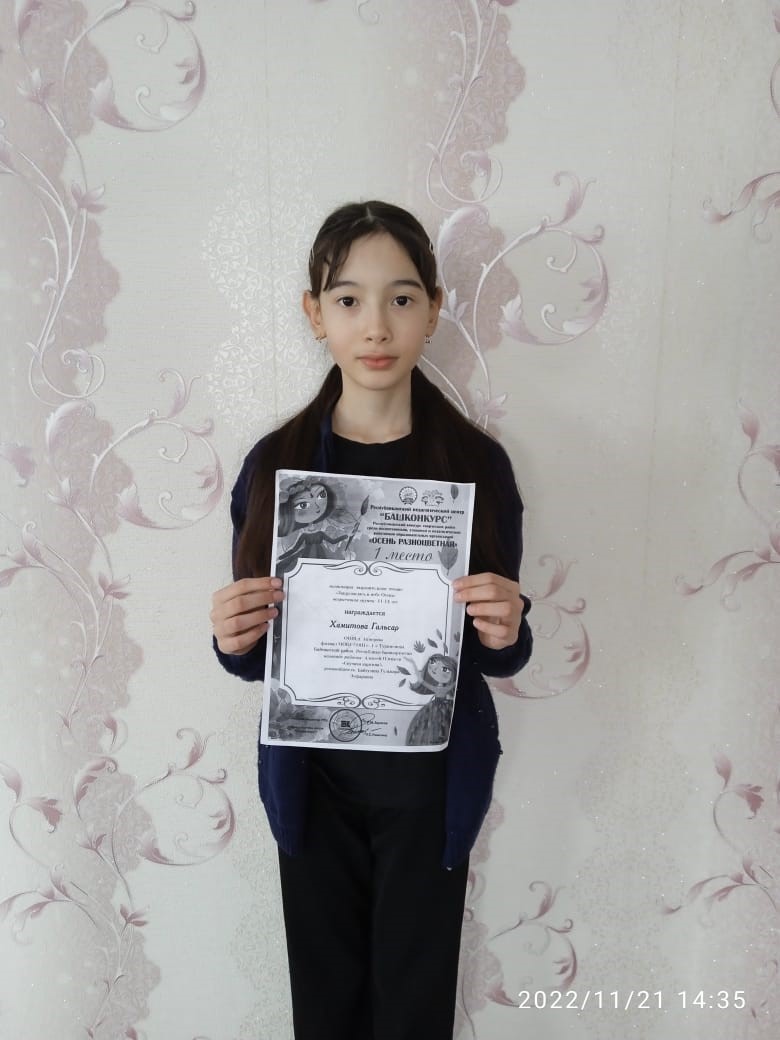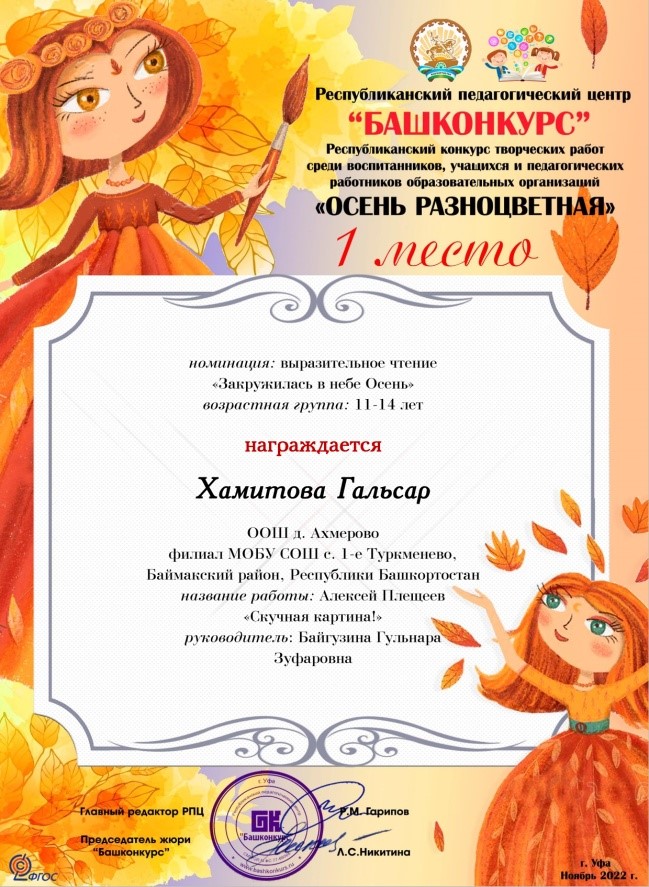 Ученица ООШ д.Ахмерово 5 класса Хамитова Гальсар участвовала в республиканском конкурсе «Осень разноцветная» и получила 1 место в номинации выразительное чтение «Закружилась в небе Осень».