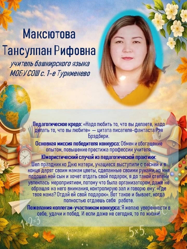 Место работы: учитель башкирского языка МОБУ СОШ с. 1-е Туркменево • Факторы, повлиявшие на выбор профессии: влияние учителя башкирского языка и литературы, хотела быть похожей на нее. • Педагогический стаж: 8 лет. • Увлечения и хобби: кулинария, путешествие, ораторское мастерство. Поддержим Тансулпан Рифовну! Ставьте