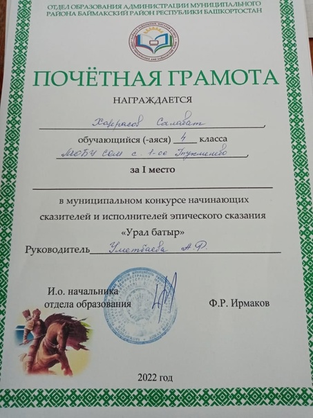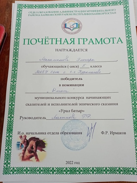 " Урал батыр " эпосын яттан һөйләүселәр бәйгеһендә , Төркмән мәктәбе уҡыусылары - Харрасов Салауат - 1 се урын , Өмөтбаева Ләйсән , Масалимова Эльнара " Өмөт " номинацияһын яулап ҡайттылар