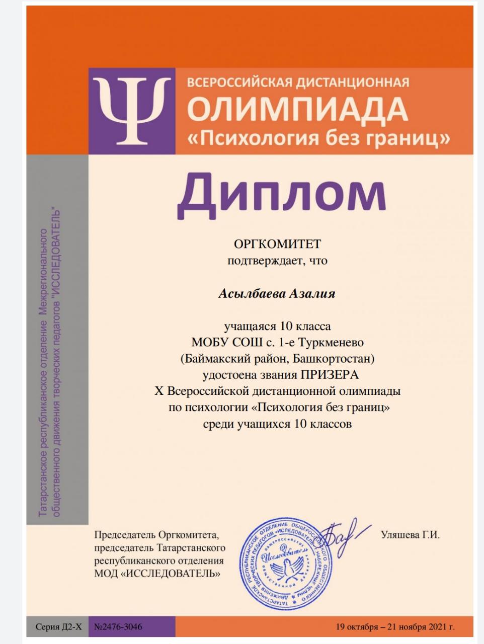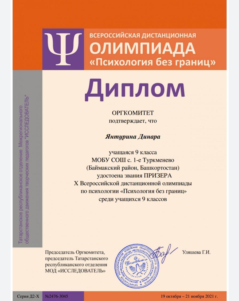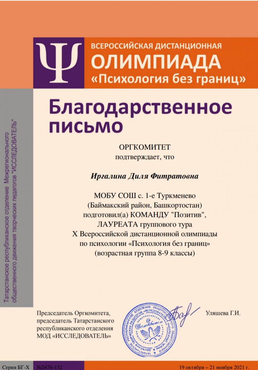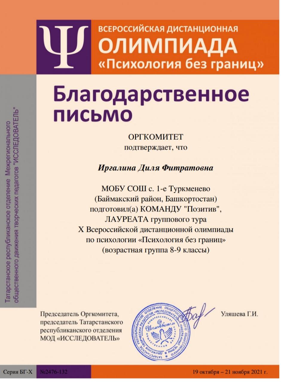 Учащиеся нашей школы приняли участие в X Всероссийской дистанционной олимпиаде по психологии «Психология без границ», которая проводилась для учащихся 6-11 классов Татарстанским республиканским отделением Межрегионального общественного движения творческих педагогов "ИССЛЕДОВАТЕЛЬ" при научно-методической поддержке Центра повышения квалификации Академии наук Республики Татарстан.